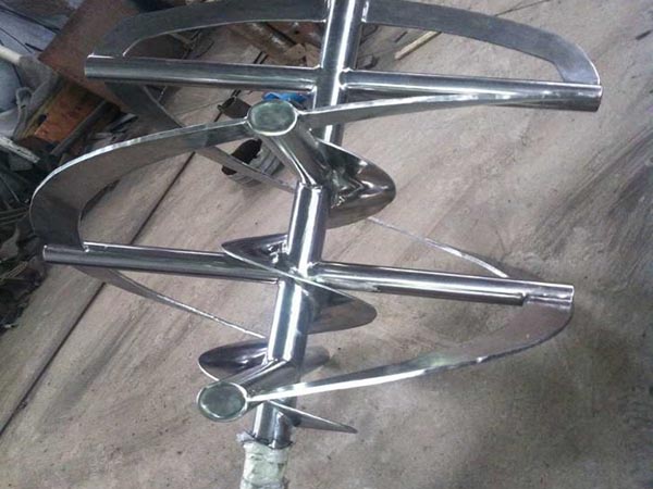 螺带式搅拌器的螺带外廊接近于搅拌槽内壁,搅拌直径大,强化了近罐壁的液体上下循环,高粘度液体的传热过程很适用。螺带螺杆组合式,同时具有螺杆和螺带的特性,强化了液体内外围的循环,特别对非牛顿型拟塑性及粘弹性液体有效。锥底螺带型,锥底螺带螺杆型,其特点是底形可和锥形釜底相配。